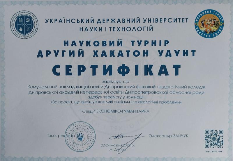 Успішність захисту засвідчує сертифікат наукового турніру Другий Хакатон УДУНТ про перемогу у номінації «За проєкт, що вирішує важливі соціальні та екологічні проблеми».